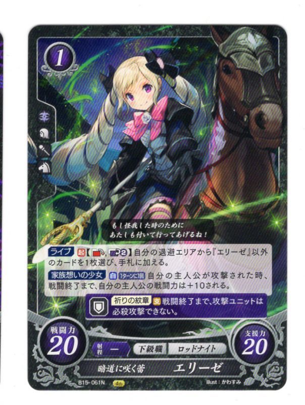 【FE0】 暗道に咲く蕾 エリーゼ N 【暗夜】 [B15-061N] 【FE0】 暗道に咲く蕾 エリーゼ N 【暗夜】 [B15-061N] 販売価格: 50円 在庫数 4枚 Tweet 数量: 1 2 3 4 返品特約に関する重要事項 お問い合わせ 【FE0】 暗道に咲く蕾 エリーゼ N 【暗夜】
